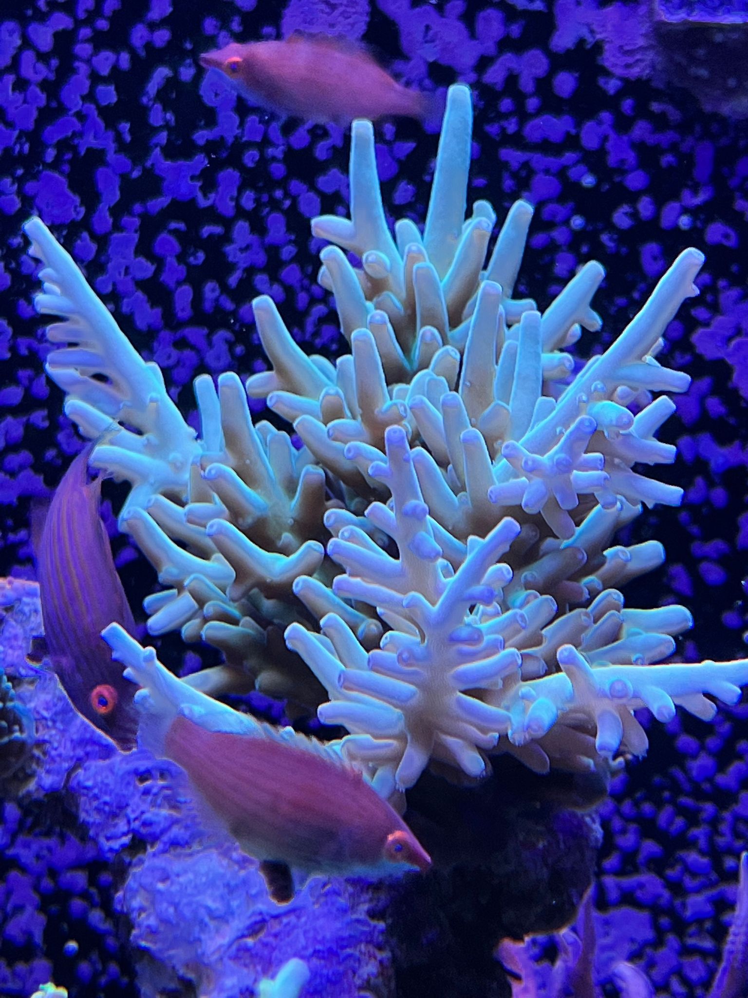 Pseudocheilinops ataenia, ein wunderschöner und nützlicher kleiner Lippfisch. Er lässt sich hervorragend in einer kleinen Gruppe pflegen, bei mir schwimmen 4 Weibchen mit 1 Männchen zusammen. Sie bewegen sich den ganzen Tag zwischen den Acroporen, ständig auf der Suche nach Parasiten. Versorgt wird die Truppe bei mir mit Mysis. Hinzu kommt, das diese Tiere absolut friedlich sind. Eine Bereicherung für jedes (SPS) Becken.
