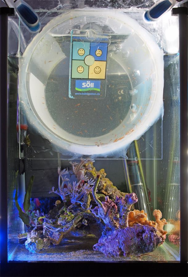 Das Becken läuft gut, ich füttere viel, deswegen liegt Nitrat meist um die 15 mg/l und Phosphat bei knapp 0,1mg/l. Die Korallen stört's nicht, mich auch nicht. Ich wechsele durch die Zucht eh recht viel Wasser, da ich kein frisch angesetztes Wasser für die Larven nehme.