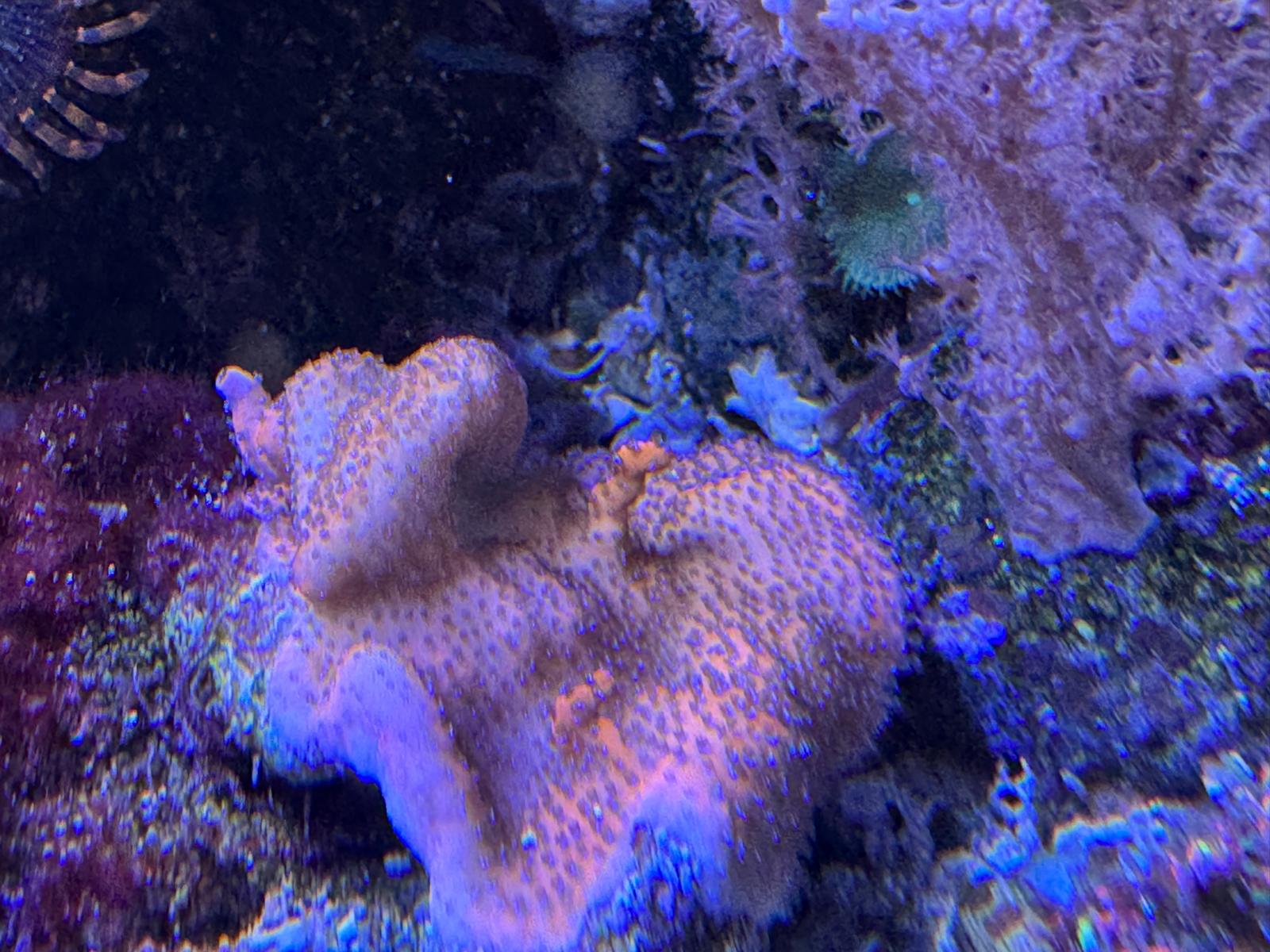 Dann mit der flach wachsenden auf dem Stein unten rechts, die war mal knall Rosa mit blauen Polypen, sie ist total verblasst.