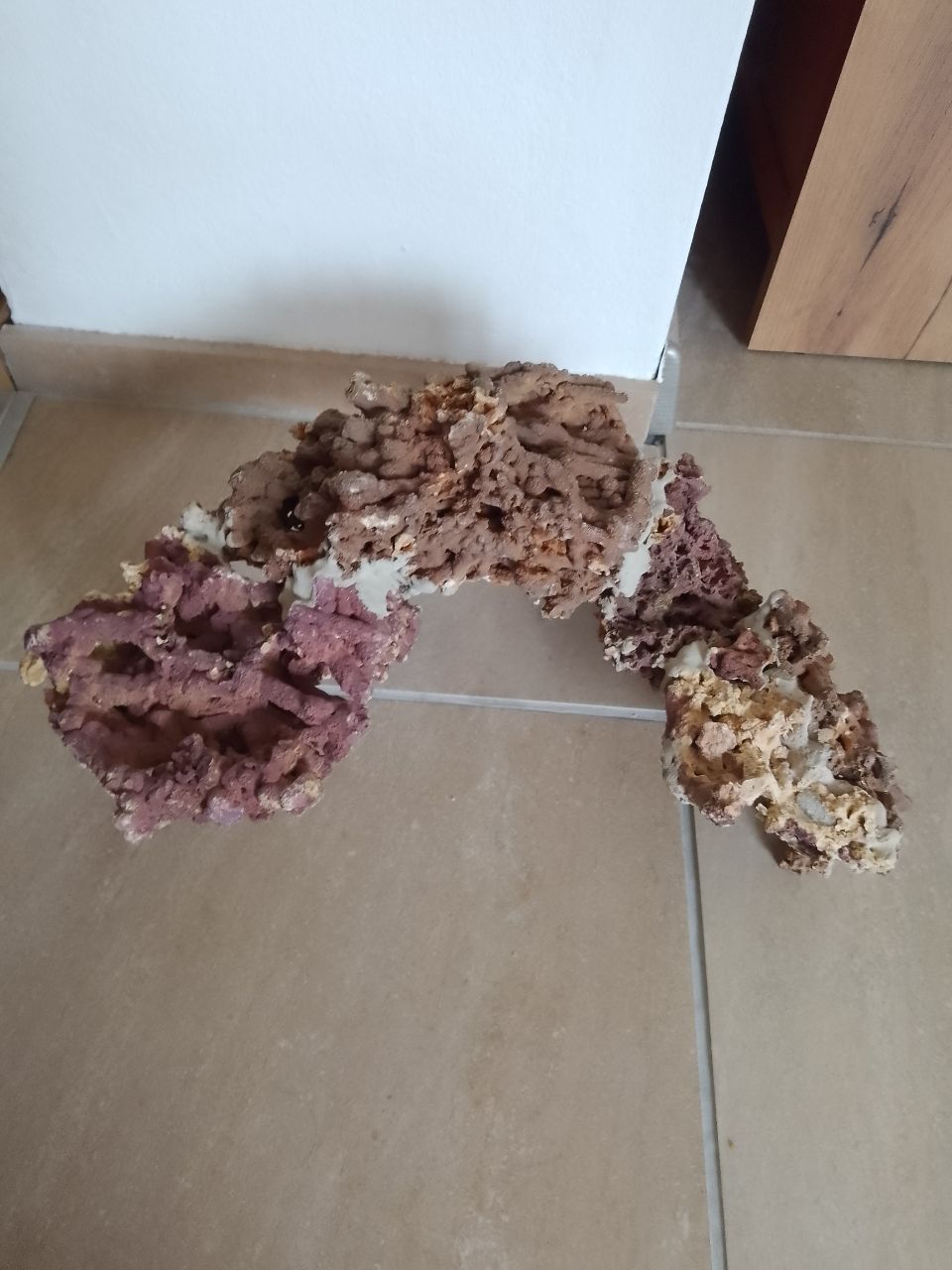 In den letzten Tagen habe ich angefangen mit meinen Steinresten eine neue Riffinsel zu bauen. Die soll in der rechten Ecke die etwas gröbere, ich nenne die mal einfach Klotzbauweise, ersetzen. Denn da habe ich das größte Strömungsproblem. Es legt sich dort gerne der Mulm ab aber leider auch direkt auf dem Stein. Die Korallen stört es nicht aber vom unschönen Faktor wird das garantiert auch nicht gut sein. Eigentlich hatte ich es damals so gebaut das das Wasser hindurch kann aber durch das Wachstum der Korallen kommt da nicht mehr viel an. Zugegeben die Restströmung klatscht da schon fast gegen eine Wand und muss dann etwas drum rum um dann darunter fließen zu können. Funktioniert mittlerweile nur noch suboptimal. Durch die neue Bauweise mit 3 Füßen wird sich das hoffentlich ändern. Die Strömung müsste da viel einfacher unter und auch vorbei fließen können.