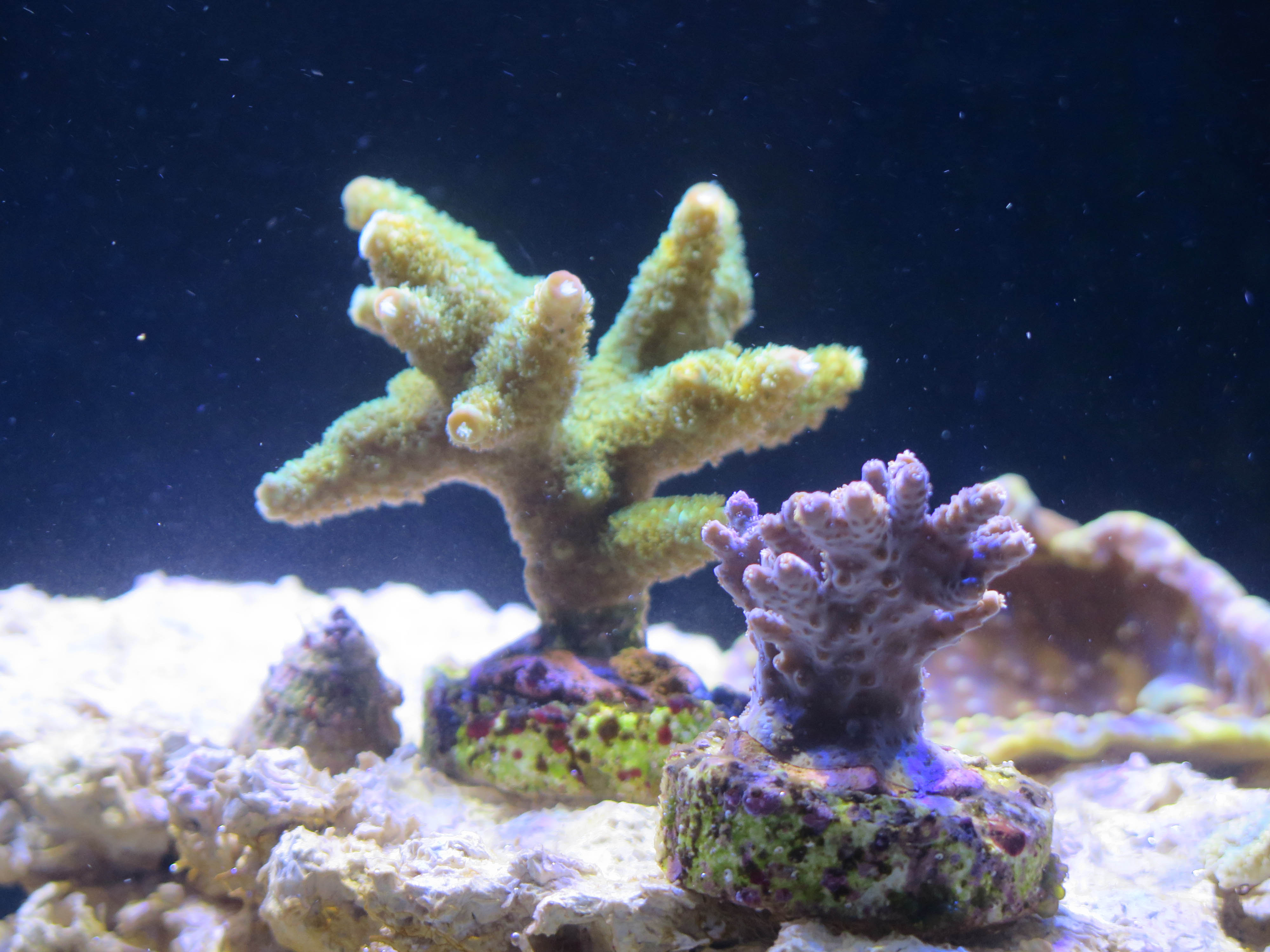 die Acroporen habe ich in Summe ca. 6 Wochen, davon stehen sie nun seit dem 07.01. im neuen Becken. Richtig, sie stehen auf der linke Seite ganz oben. Beströmt werden sie von der MP60 im Reef Crest Mode (also wechselnde Intensitäten). Die Florida steht immer wie eine 1, egal wann ich reinschaue. Die "Hyazinthus" - sofern es eine ist - sieht auch immer genau so aus. Auch im vorigen Becken das gleiche Bild.