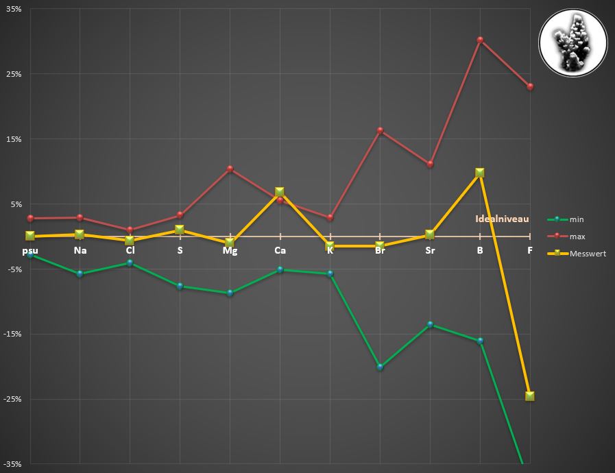 Sali 35.2, KH ist etwas niedrig 6.8, Calcium mit 455 zu hoch (ich nehme jetzt wieder den Salifert), Barium mal wieder tief, Fluor etwas niedrig,