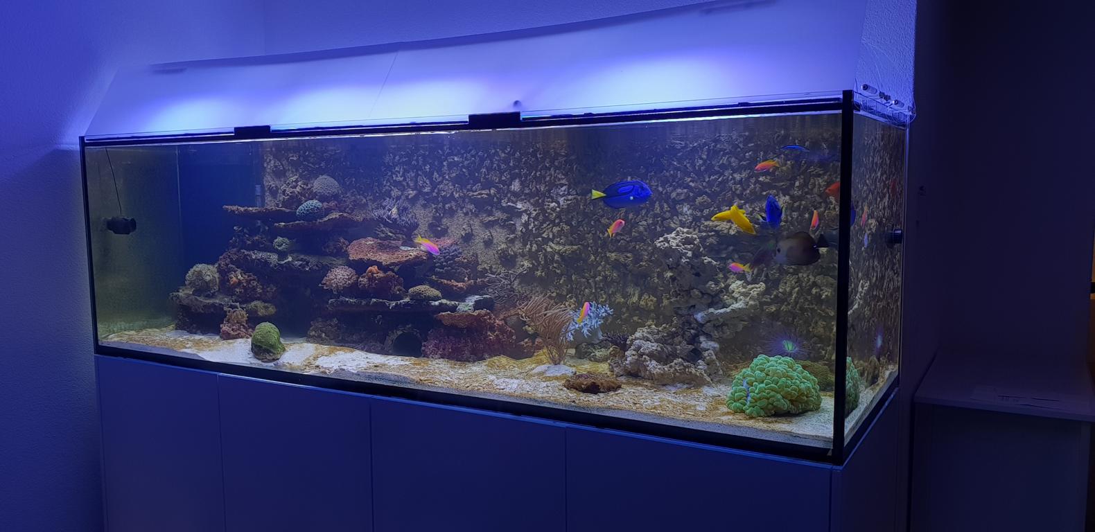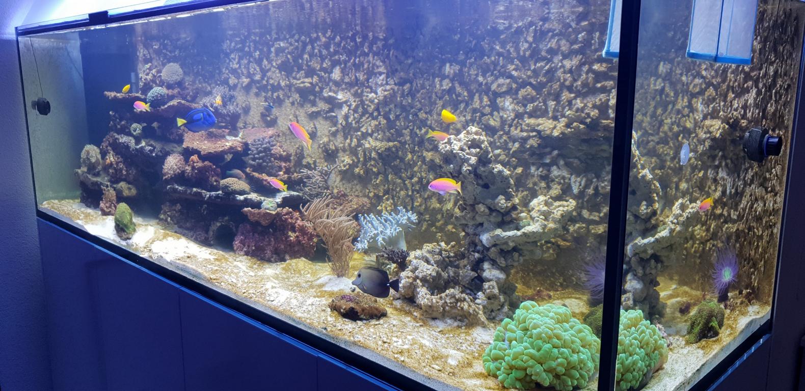 Im Gegenzug muss ich selbstverständlich auf eine ausreichende Nährstoffversorgung achten. Klar ist auch, dass ein Becken mit wenig(er) Dekorationsoberfläche unterumständen einfacher zu fahren ist als eines mit mehr Oberfläche. Dieser Punkt ist auf dem Radar und wird permanent unter Kontrolle gehalten. Ich wollte auf keinen Fall ein optisch zu steriles Becken, ich wollte eines wo sich die Tiere wohl fühlen und ich es für schön empfinde (zweites ist ja bekanntlich Ansichtssache). Bis jetzt sieht es für die Tiere gut aus, viele Einsiedler, Schnecken und Seeigel sind davon begeistert. Auch der Borsti hat gefallen daran und der Putzerlippfisch und ein paar Anthias schlafen sogar in der Rückwand.