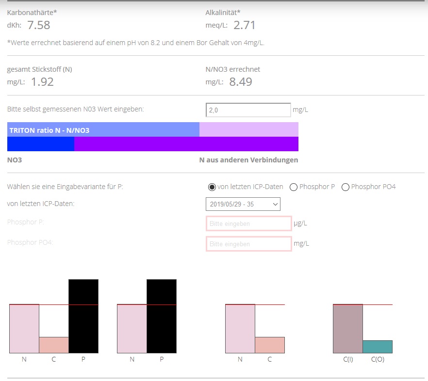 Desweiteren kann man in der Analyseauswertung noch selbst gemessene Nitrat und Phosphatwerte eingeben und bekommt dann Verhältnisdiagramme angezeigt.